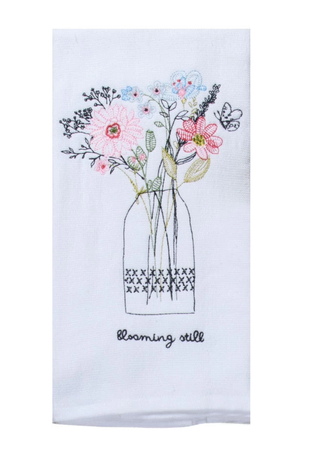 Encourage the kitchen to bloom with this happy & modern floral collection. This special towel features embroidery on our customer favorite 2-in-1 functionality dual purpose terry towel! The flat weave face is ideal for drying glassware, and absorbent terry cloth back side is great for everyday kitchen tasks! 16 in x 26 in, 100% cotton exclusive of decoration.