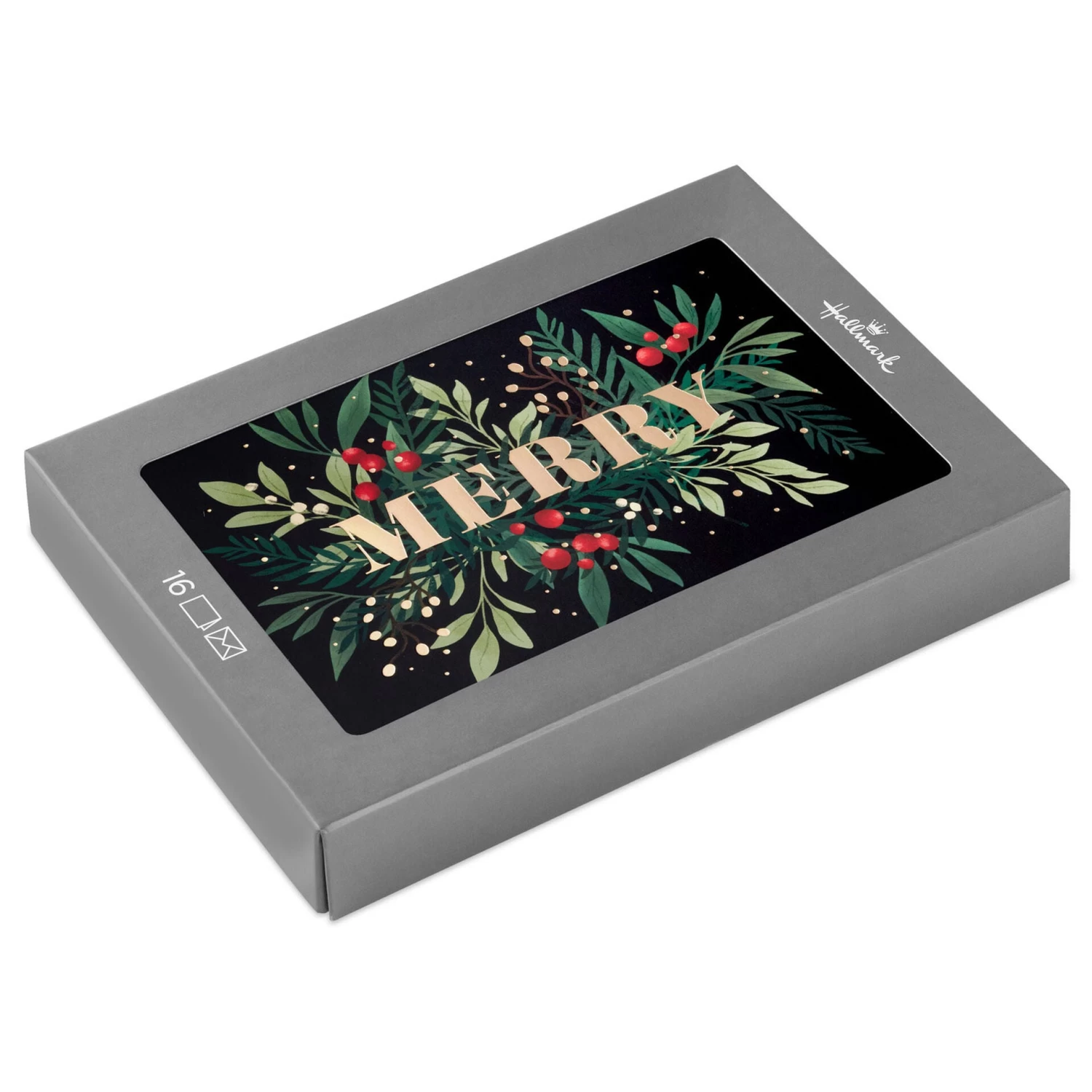 Boxed Christmas cards feature vivid artistry of holiday greenery and red berries against a dark background. Perfect for letting everyone on your list know they’re in your thoughts this holiday season.