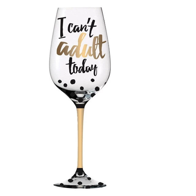 The stunning colorful wine glass features black and metallic gold accents with “I Can’t Adult Today” written on the cup in a festive scroll.