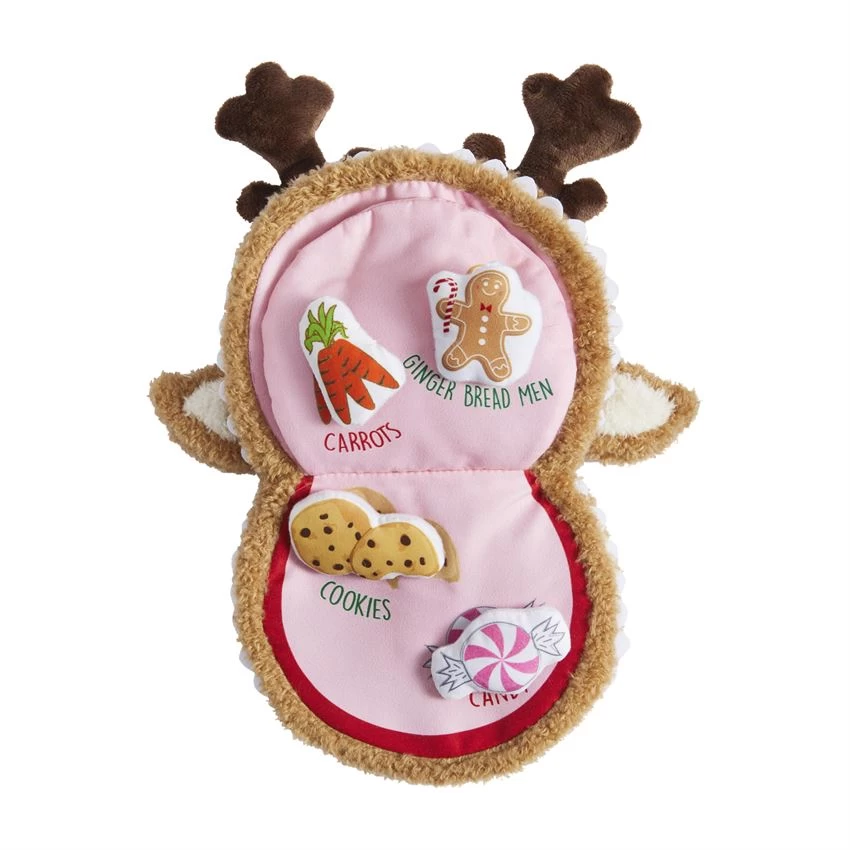 What do reindeer snack on? Soft minky puppet book features six plush “snacks” for sensory discovery and lots of laughs. Material: Polyester. Size: 11″ x 5 3/4″.