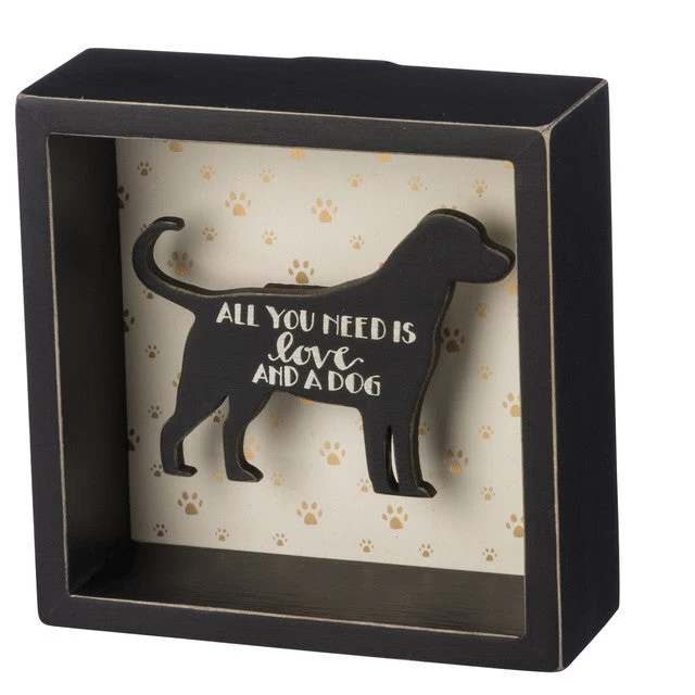 An inset wooden box sign lending a hand lettered “All You Need is Love And A Dog” sentiment, dimensional dog detail, paw print background, and gold metallic accents. Easy to hang or can free-stand alone.