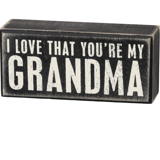 A classic black and white wooden box sign featuring a distressed “I Love That You’re My Grandma” sentiment. Easy to hang or can free-stand alone.