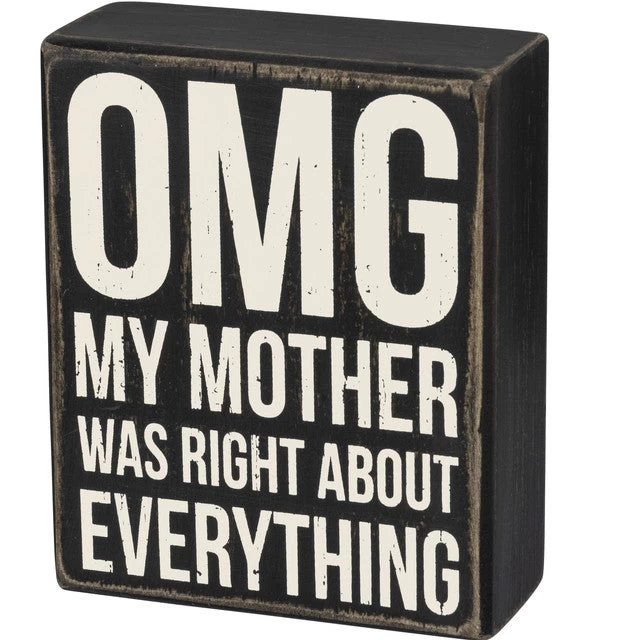 A classic black and white wooden box sign featuring a distressed “OMG – My Mother Was Right About Everything” sentiment. Easy to hang or can free-stand alone.